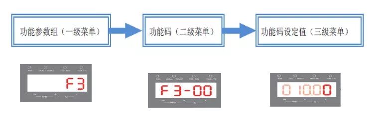 1 在三级菜单下,若参数没有闪烁位,表明该功能码不能修改,可能原因:①为不可修改参数;②该功能码在运行状态不可修改