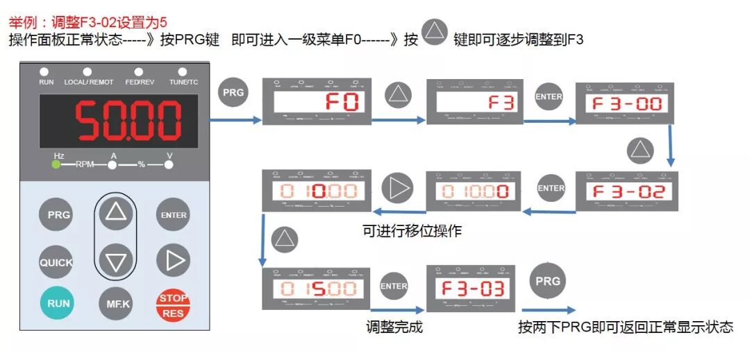 1 在三级菜单下,设置完参数按Enter键直接进入下一个功能码。在每一级菜单下,按PRG键即可返回上一级